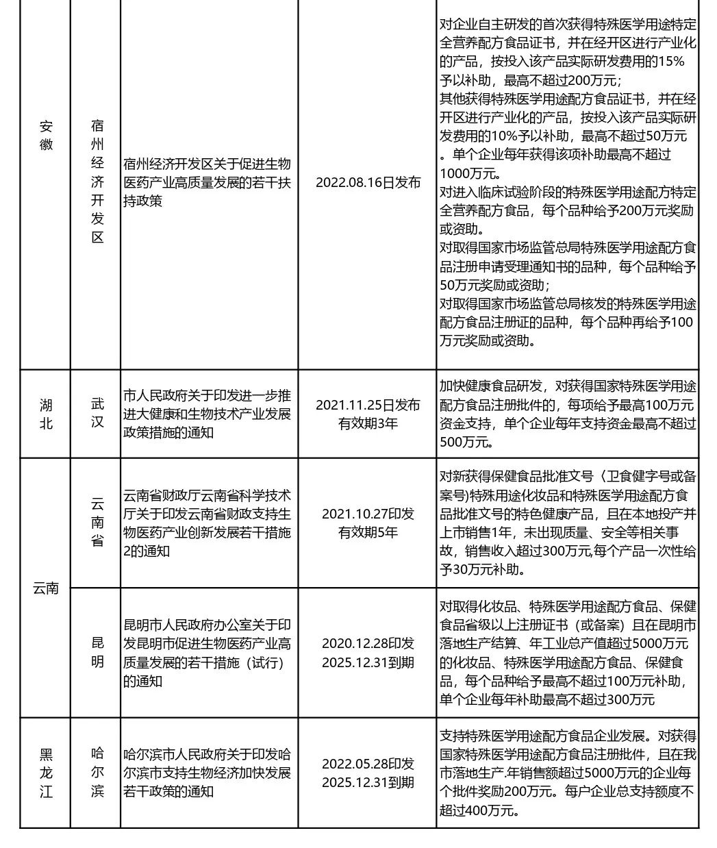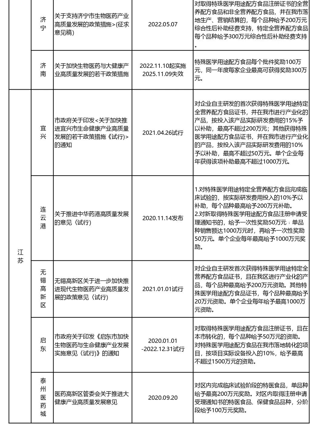 近年來,隨著國(guó)家對(duì)生物醫(yī)藥產(chǎn)業(yè)的傾斜、支持,國(guó)內(nèi)多個(gè)城市紛紛出臺(tái)了支持力度更大、扶持范圍更廣的生物醫(yī)藥產(chǎn)業(yè)政策,鼓勵(lì)企業(yè)創(chuàng)新發(fā)展,支持范圍中也包括了特醫(yī)食品,提出對(duì)獲得特醫(yī)食品批件的生產(chǎn)企業(yè)給予一定的經(jīng)費(fèi)獎(jiǎng)勵(lì)支持。